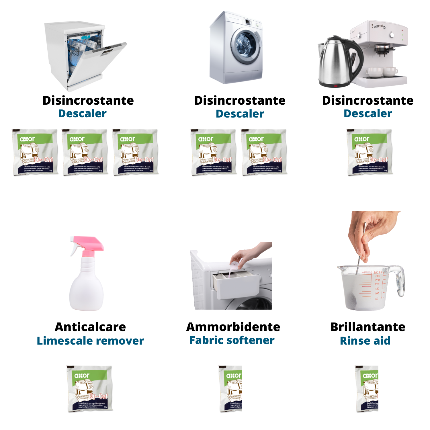 DE-CAF è un decalcificante in polvere, in bustine predosate pronte per l’uso, che rimuove il calcare in modo naturale ed efficace da macchine da caffè, bollitori ed umidificatori.